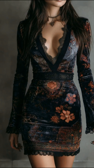 A chic bohemian mini dress in luxurious velvet, featuring a romantic floral print and delicate lace-trimmed V-neckline. The bodycon silhouette accentuates curves, while the mini length adds a playful, stylish touch—perfect for both day and evening wear.