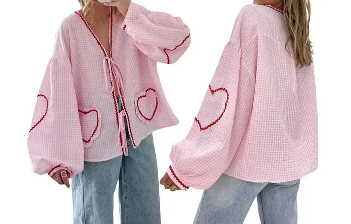 Add a playful touch to your wardrobe with this Women’s Long Sleeve Plaid Blouse featuring heart embroidery and a front bowknot tie-up design. The relaxed fit, puffed sleeves, and charming heart-shaped pockets make this blouse both stylish and comfortable. Perfect for casual outings or adding a fun twist to your everyday look, this blouse pairs beautifully with jeans or skirts. The soft plaid fabric ensures comfort, while the whimsical details make it a standout piece in any collection.