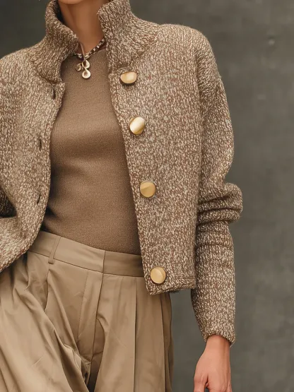 This mixed color knit cardigan brings elevated comfort into your transitional wardrobe. The high neckline and golden buttons offer a refined edge to a classically cozy piece, making it a must-have layering essential. Its cropped cut and rich texture make it ideal for pairing with wide-leg trousers, sleek turtlenecks, or slip dresses.